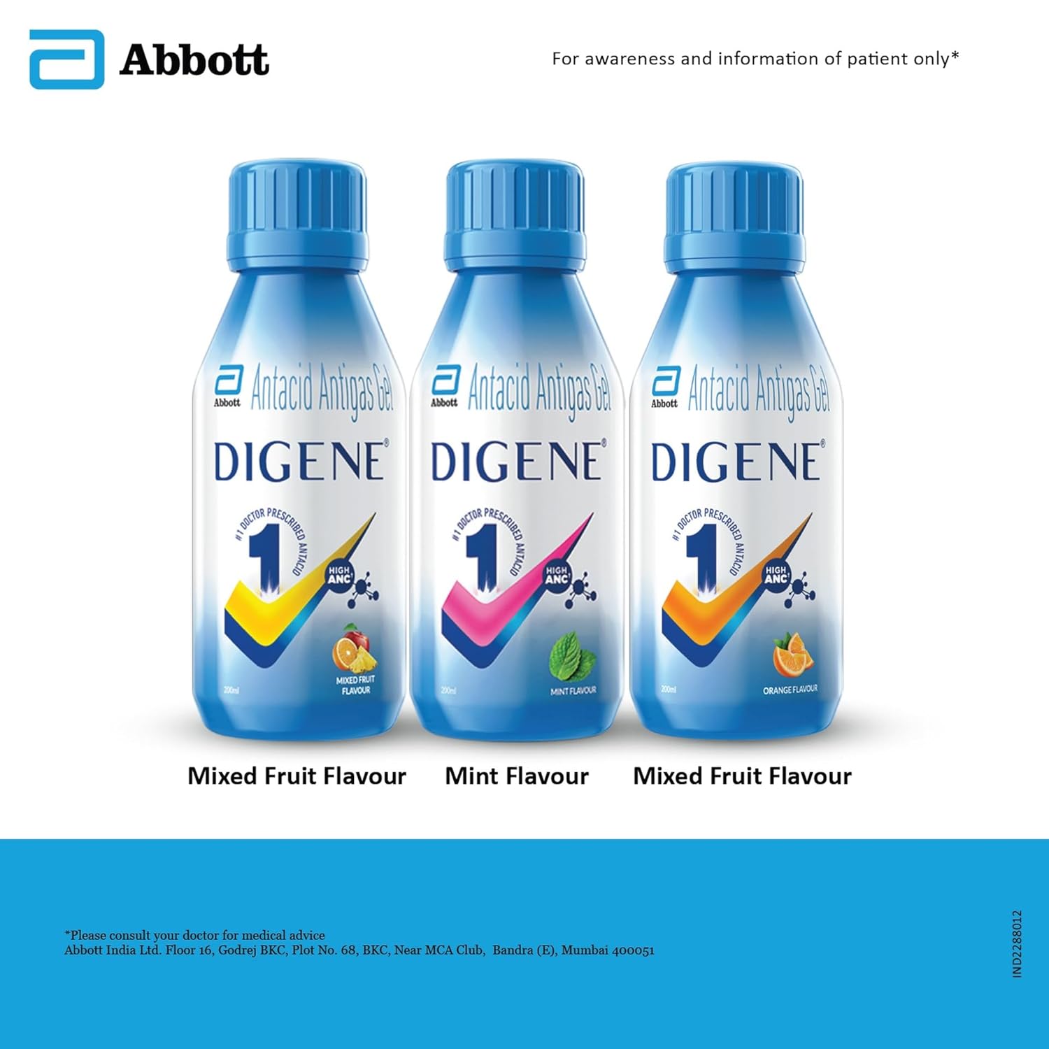 Digene Gel provides relief from acidity and gas whenever acidity strikes. It is a sugar-free liquid that provides effective action against acidity, reduces stomach pain and protects the stomach from making excess acid for long-lasting relief. Digene Oral Liquid comes in a handy bottle that can be kept within easy reach at home. Its scientifically developed combination of active ingredients provides a High ANC (Acid Neutralising Capacity) property. Digene Gel for Acidity and Gas relief is available in 200 ml and 450 ml bottles.