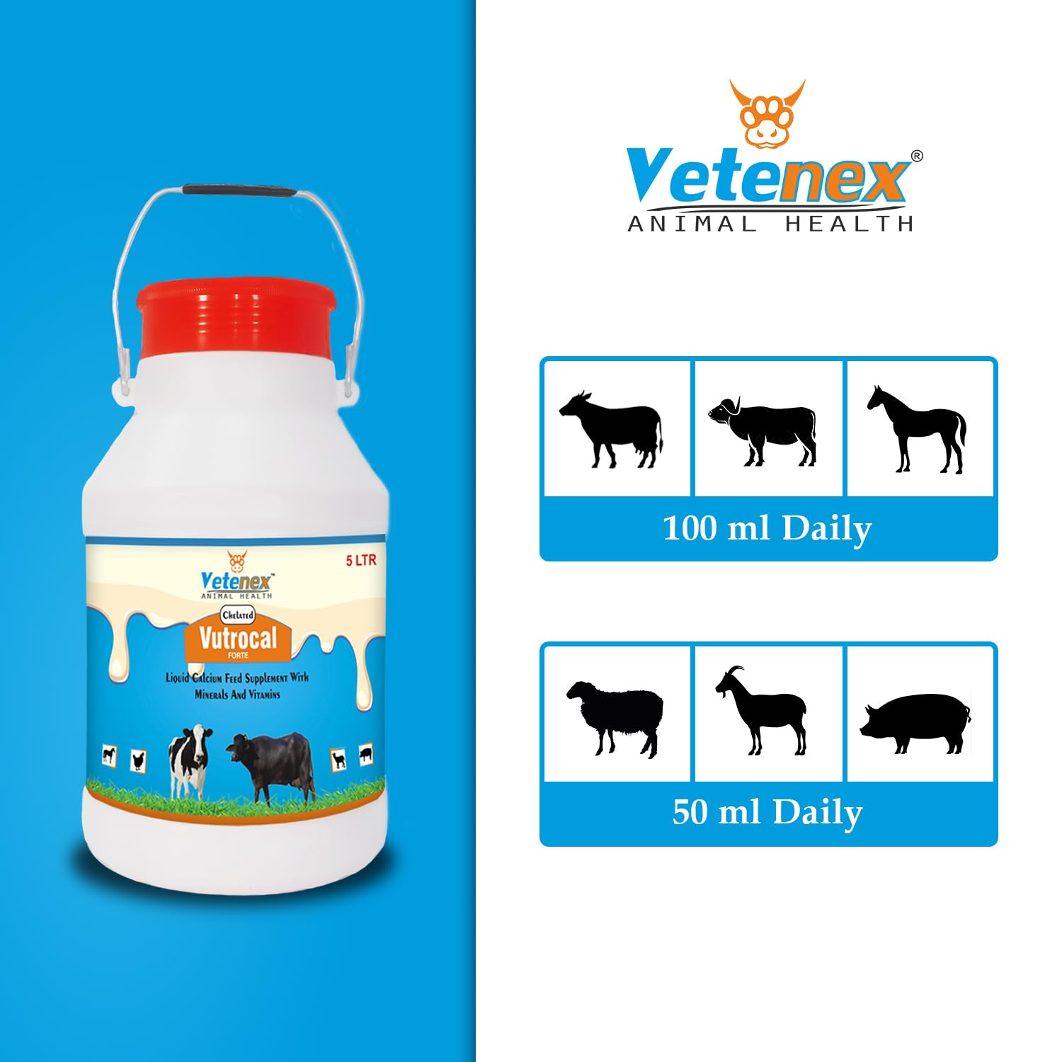 VETENEX Vutrocal Forte is a chelated liquid calcium supplement enriched with trace minerals and Vitamin D₃. It offers high bio-availability of calcium and supports several benefits for farm animals like cattle, cows, buffalo, goats, sheep, pigs, horses, poultry, birds, and fish: